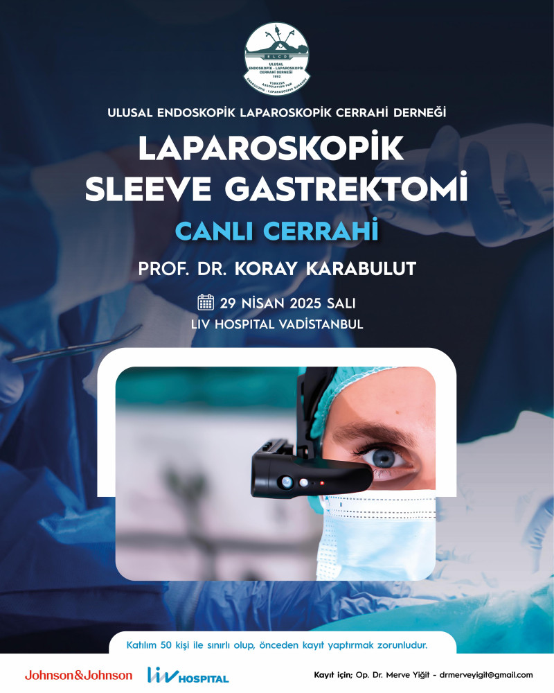 Derneğimizin uzaktan eğitim faaliyetleri kapsamında, Johnson & Johnson iş birliği ile aralıklı olarak canlı ameliyat yayınları yapılacaktır. Bu yayınlardan birincisi 29 Nisan 2025 saat 10:00’da, Liv Hospital Vadistanbul’da, Prof Dr Koray Karabulut tarafından yapılacak olan Laparoskopik Sleeve Gastrektomi ameliyatı olacaktır. Yayını izleyebilmek için, drmerveyigit@gmail adresine mail gönderilerek kayıt yaptırılması gerekmektedir. Katılım 50 kişi ile sınırlı ve ücretsizdir.